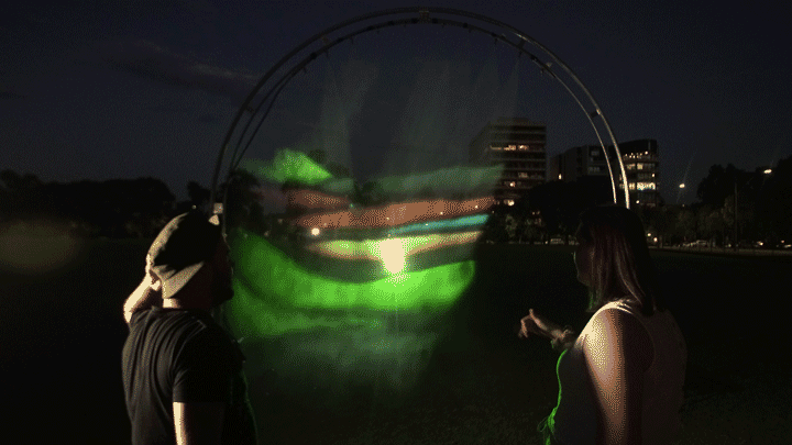 Tracing place was created by Michaela McHugh and Lucy Allinson under the mentorship of Joel Zika and James Voller of Collide. The two artists, both local to the Geelong and Surf Coast regions, produced a deeply reflective work in the form of Tracing place, transforming Little Malop Street with enormous digital projections onto a screen of water mist.